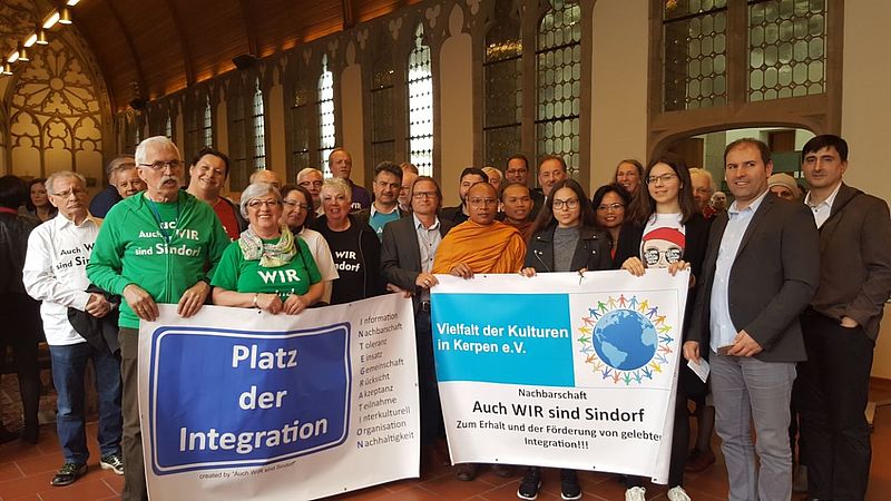„Auch WIR sind Sindorf“ ist ein Zusammenschluss von Nachbarn, Anwohnerinnen und Anwohnern, Eigentümern sowie Freundinnen und Freunden aus Kerpen-Sindorf und hat es in weniger als 1,5 Jahren geschafft, von einem sozialen Brennpunkt in einer anonymen Nachbarschaft aus 47 Nationen, 6 politischen Parteien und vielen Religionsgemeinschaften zu einer zusammenstehenden Nachbarschaft zu werden, die sich für Integration und das menschliche Miteinander in einer Gemeinde einsetzt und jetzt schon bundesweite Aufmerksamkeit erlangt hat. Zunächst ist „Auch WIR sind Sindorf“ gelungen, eine Grünfläche, die als Spielplatz dient und ursprünglich bebaut werden sollte, zu erhalten und als bundesweit ersten offiziellen „Platz der Integration“ zu benennen. Dazu gab es ein zweitägiges Integrationsfest unter der Schirmherrschaft des Bürgermeisters und mit einem interreligiösen Segen durch fünf Religionsgemeinschaften. Zusätzlich wurde ein Seniorencafé organisiert, das nun regelmäßig im Sommer stattfindet und Jung und Alt zusammenbringt.
