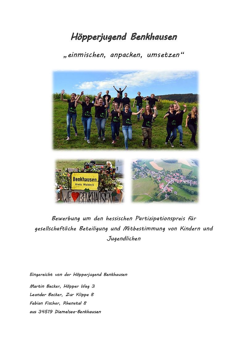 Die Höpperjugend Benkhausen ist in verschiedenen Themenbereichen aktiv. Es handelt sich um einen Zusammenschluss von fast allen Kindern und Jugendlichen im 170-Einwohner starken Dorf. Zu den regelmäßigen Aktivitäten zählt die Öffnung des Jugendraumes an mindestens vier Tagen pro Woche. Der Jugendraum ist der zentrale und einzige Treffpunkt für Kinder und Jugendliche im Dorf. Er wird selbstverwaltet und trägt selbst 50% der laufenden Kosten. Seit einigen Jahren engagiert sich die Höpperjugend gemeinsam mit dem Heimat- und Verkehrsverein und dem NABU im Bereich Umwelt- und Naturschutz, übernimmt Patenschaften für Vogel-Nistkästen, unterstützt den Tag der sauberen Landschaft und schneidet die Laichplätze der seltenen Geburtshelferkröte im Steinbruch frei. In den letzten zwei Jahren engagierten sich die Beteiligten in der „Steuerungsgruppe Dorfentwicklung", setzten sich für die Einrichtung eines Multifunktionsplatzes ein und unterstützen jetzt aktiv die Baumaßnahme.