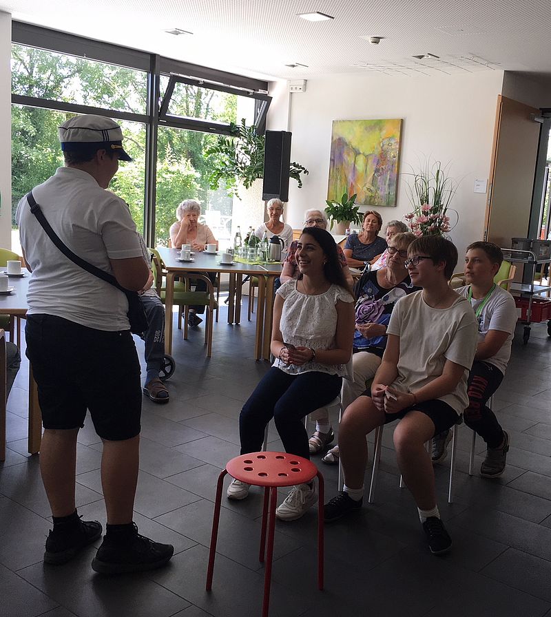 Einmal im Monat treffen sich die Schülerinnen und Schüler der AG Improvisationstheater Generationen der Friedrich Schelling Gemeinschaftsschule mit den Bewohnerinnen und Bewohnern des Robert-Breuning-Stifts in Besigheim zum Generationendialog. Jeden Monat gibt es in unserem Erzählcafé ein bestimmtes Thema zu dem die Schüler Gedichte vortragen oder kleine Szenen spielen und Fragen vorbereiten. Bei anschließendem Kaffee und Kuchen können die Bewohnerinnen und Bewohner die Fragen der Schüler beantworten und aus ihrem Leben erzählen. Das Anliegen des Projektes ist es, den Austausch und das Zusammenkommen von Jung und Alt in der direkten Umgebung zu fördern. Respektvoller Umgang, einander zuhören, Erinnerungen, Erfahrungen und Erlebnisse austauschen, sich gegenseitig helfen und voneinander lernen.