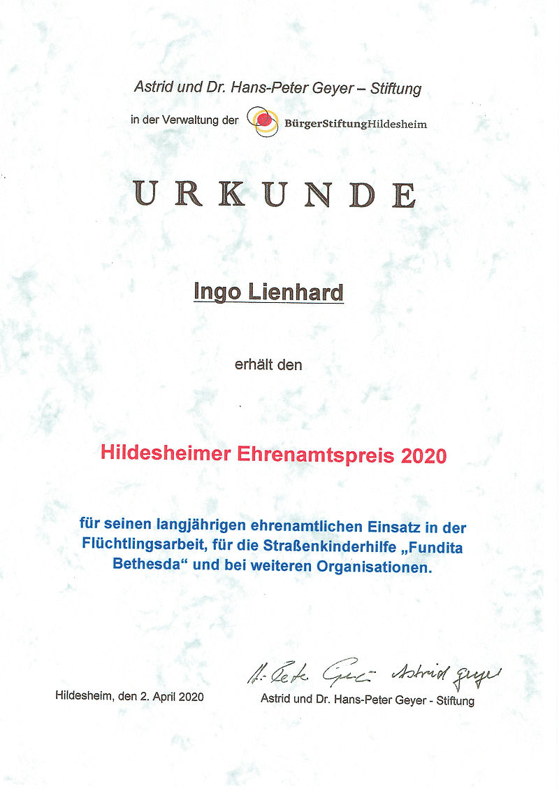 Ehrenamtlicher Einsatz in der Arbeit mit geflüchteten Menschen als Betreuer und Integrator von geflüchteten Einzelpersonen und Familien in allen Lebens-, Arbeits-, Rechts- und Gesellschaftsbereichen, um eine umfänglich gelungene Integration auf Willkommensbasis zum Wohl der Menschen sowie unserer Gesellschaft und den kommenden Generationen zu ermöglichen. Seit 2013 wird durch Ingo Lienhard mit Unterstützung von Freunden und Freundinnen und integrierten geflüchteten Menschen den neu angekommenen geflüchteten Menschen in allen Lebensbereichen Unterstützung gegeben, Kontakte, Paten und Patinnen, Arbeitsstellen, Wohnungen, Möbel und Kleidung sowie Hilfen zum Spracherwerb vermittelt oder organisiert. Persönliche Begleitung als Integrationshelfer bei Anerkennungsverfahren, Gerichten, Behörden und Ärzten und Ärztinnen für bisher 68 Menschen. Dabei als ehrenamtlicher, sozialer Netzwerker und Unterstützer auch für die Brücke der Kulturen und das Michaelis Weltcafe sowie in der Freien evangelischen Gemeinde Hildesheim tätig. Ehrenamtlicher Einsatz für Straßenkinder gemeinsam mit der Familie seit 2001 Unterstützung für die Straßenkinderhilfe Fundita Bethesda in Rumänien in Form von Hilfstransporten mit Sach- u. Kleidungsspenden und Verteilung der Hilfsgüter, teilweise direkt vor Ort sowie Informationsveranstaltungen.