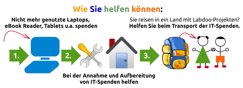 Ehrenamtliche Labdoo-HelferInnen geben nicht mehr genutzten Laptops und Tablets, die zuhause oder in Unternehmen ungenutzt herumliegen, ein 2. Leben. Das gemeinnützige Hilfsprojekt Labdoo.org ist in Deutschland und weiteren 134 Ländern der Welt aktiv. Labdoo.org unterstützt über 565.000 Schüler und Schülerinnen und Flüchtlinge in über 1.800 Schulen, Waisenhäuser, Kinder-/Jugend- und Flüchtlingsprojekte im In- und Ausland kostenlos mit IT-Spenden (Stand: Sommer 2020). Unsere Ziele sind: Fluchtursachen im Ausland bekämpfen, in Deutschland Integration und digitale Teilhabe unterstützen, speziell Home Schooling in Corona-Zeiten, Zugang zu IT, Bildung, Sprachkursen und Teilhabe an der digitalen Gesellschaft ermöglichen. Bereits seit Jahren vermittelt Labdoo IT-Spenden für Integration und Deutschkurse an Flüchtlings- und Integrationsinitiativen und Schulen. Aktuell auch für benachteiligte Schüler und Schülerinnen für Home Schooling, damit diese am digitalen Unterricht in Corona-Zeiten teilhaben können. Jede IT-Spenden wird mit über 300 freien Lern-, Web- und Office-Programmen und OER (freien Lerninhalten) wie Sprachkursen, Wikis u.a. bespielt, für blinde oder hörgeschädigte User mit spezieller Software wie Screenreadern. Alles auf Basis von Open Source und OER. Flugpaten bringen IT-Spenden CO2-neutral zu Schulen und Projekten im Ausland und holen sie zum Recycling zurück. Jeder kann beitragen, als IT-Spender, als Flugpate oder indem er einfach nur von Labdoo.org erzählt oder sich bei Labdoo engagiert.