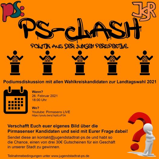 Anlässlich der Landtagswahl, die am 14.03.2021 stattfand, veranstaltete der Jugendstadtrat Pirmasens eine Podiumsdiskussion. Bei der Veranstaltung „PS-Clash: Politik aus der jungen Perspektive“ debattierte der Jugendstadtrat mit allen Wahlkreiskandidatinnen und -kandidaten von insgesamt acht Parteien, die im Wahlkreis 48 antraten. Aufgrund der aktuellen Situation wurde die Veranstaltung virtuell durchgeführt und auf dem YouTube-Kanal "Pirmasens LIVE" gestreamt, sodass die Begegnungen und Kontakte auf ein Minimum beschränkt werden konnten. Die Übertragung wurde fast 1000 Mal aufgerufen und auch im Regionalfernsehen gezeigt. Ziel der Podiumsdiskussion war es, vor allem die junge Generation zu erreichen, unentschlossene Erstwählerinnen und Erstwähler zum Gang an die Wahlurne zu bewegen und die Standpunkte der Wahlkreisbewerberinnen und -bewerber zu jugendlichen Themenkomplexen herauszuarbeiten. Die Themenauswahl übernahm das Gremium, da für alle Kandidatinnen und Kandidaten zu jedem Zeitpunkt gleiche Bedingungen gelten sollten. Gleichzeitig wurden bestimmte Fragerunden für die Pirmasenser Jugendlichen geöffnet. Fast 60 Fragen aus den unterschiedlichsten Themengebieten erreichten den Jugendstadtrat und bewiesen damit das Politikinteresse der regionalen Jugend. Da gerade aufgrund der aktuellen Pandemiesituation keine klassischen Informationsveranstaltungen zu Wahlen möglich sind, war es dem Jugendstadtrat sehr wichtig, diese Aufgabe stellvertretend für die Pirmasenser Jugend zu übernehmen und zentral, fair und unvoreingenommen eine Basis für wegweisende Entscheidungen zu bieten.