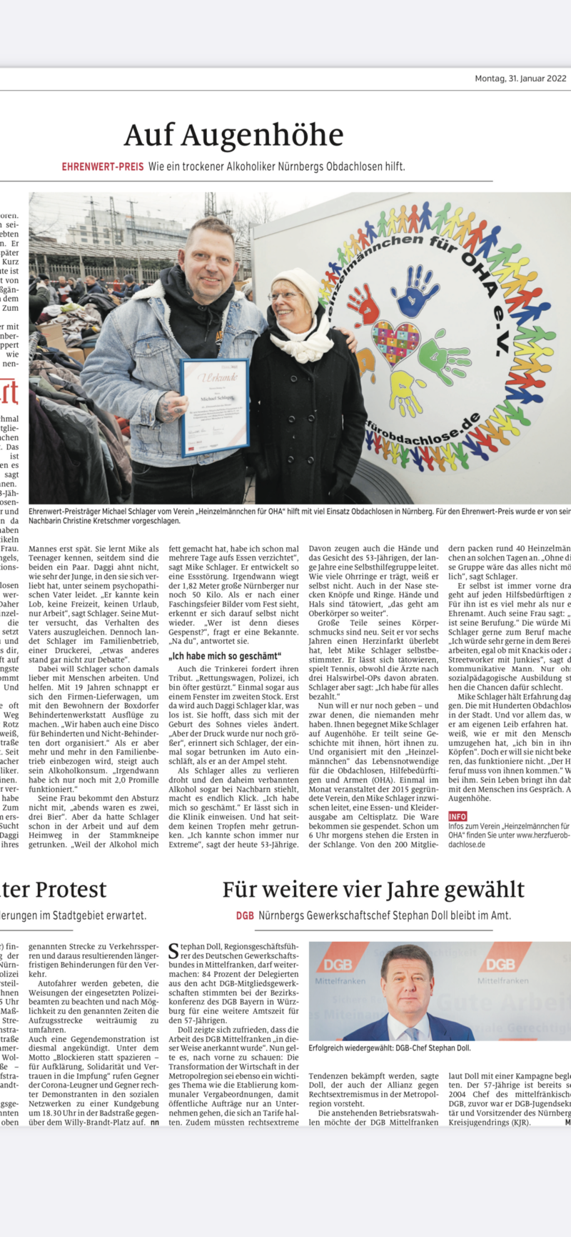 Mike Schlager setzt sich als 2. Vorsitzender der Heinzelmännchen für OHA sehr stark für obdachlose und im allgemeinen Sinn hilfsbedürftige Menschen jeglicher Herkunft und Religionszugehörigkeit ein. Mittlerweile ist die Zahl der betreuten Personen auf über 250 angestiegen. Sie werden mit allem zum Überleben notwendigen versorgt und in familiärer Atmosphäre umsorgt.