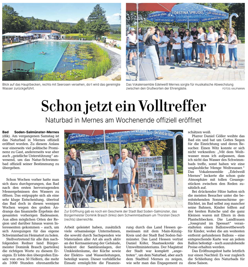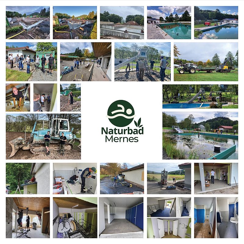 Der Ortsbeirat Mernes hat die Sanierung des Quellschwimmbad angeregt. Ein Kerteam hat den Umbau in ein Naturschwimmbad beschlossen. In 4 Jahren wurde das Projekt geplant und in die Tat umgesetzt. 2024 wurde das Naturbad eröffnet. Projektleiter war Thorsten Desch. Er hat diese Aufgabe – wie alle ca. 52 Helfer – ehrenamtlich geleistet. Mit dem Neubau wurde auch das vorhandene Gebäude komplett entkernt und für den Badebetrieb wieder neu hergerichtet (neues Pumpenwerk, neue Umkleide und Duschen, neue Bewirtschaftung, ...) Darüber hinaus ist das Konzept so entwickelt, dass auch der angrenzende Barfußpfad und der Soccerplatz des FSV Mernes eingebunden ist. Auch ist die Förderung des Tourismus im Fokus des Projektes. Für Radfahrer des vorbeiführenden Radweges wurde eine separate Einkehrmöglichkeit / Rastmöglichkeit geschaffen. Berichte: https://wochen-bote.de/2021/12/03/aus-quellenbad-wird-ein-zukunftssicheres-naturbad/ https://www.gnz.de/lokales/main-kinzig-kreis/bad-soden-salmuenster/bad-soden-salmuenster-naturbad-mernes-nimmt-weiter-formen-an-WEM56EMUI5CFTP2YXM2WECVX6M.html Video vom HR Fernsehen ab Minute 07.35: https://www.ardmediathek.de/video/die-ratgeber/die-ratgeber-vom-15-05-2024/hr-fernsehen/YTQ0MTU2YmItOGM4ZS00YzliLWE0ZWEtN2FmZGVlOGRiODll