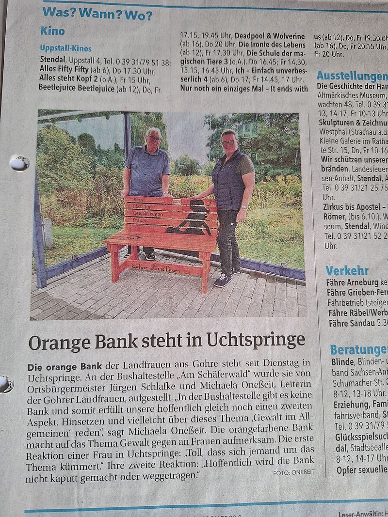 Das Projekt „Orange Bank“ soll auf das Thema „Gewalt gegen Frauen im ländlichen Raum“ aufmerksam machen. Das ländliche Nachbarschaftsgefüge ist im Vergleich zur hohen Anonymität in der Stadt von festen Normen geprägt. Der soziale Zusammenhalt im Dorf lässt wenig Raum für Unterstützung, wenn eine Frau im ländlichen Raum Gewalt erfährt. Diese Gewalt zeigt sich nicht immer in körperlicher Form. Auch seelische Gewalt gegen Frauen ist ein Tabu-Thema. Mit der „Orangen Bank“ möchten wir dieses Tabu brechen und die Öffentlichkeit zur Diskussion vor Ort anregen. Wir wollen den Frauen Mut machen, sich Hilfe zu holen, und ihnen zeigen: Sie sind nicht allein. In den Gemeinden fehlen Anlaufstellen. Wenn eine betroffene Frau die Hürden in die Stadt überwunden hat, stellt die digitale Überwachung (z.B. GPS o. Handy-Tracking) die nächste Herausforderung dar. Uns ist es wichtig, den Bekanntheitsgrad verschiedener Akteurinnen im Landkreis Stendal zu erhöhen. Dafür nutzen wir ein QR-Codes auf kleinen Karten die an der Bank befestigt sind. Hinter dem QR-Code verbergen sich die Telefonnummern der Ansprechpartnern. Mit dem Bau der Bank im Herbst 2023 haben wir unser Projekt gestartet. Im Juni 2024 hat der Verein das Projekt bei einer Auftaktveranstaltung vorgestellt. Die Bank stand bis September sichtbar in der Wandelhalle in Stendal. Seit September 2024 ist die Bank durch die Ortschaften der zugehörigen Dörfer im Landkreis Stendal unterwegs. Dieses organisiert der Verein eigenständig. Durch die Verwendung einer auffälligen, orangefarbenen Bank als Symbol schafft sie einen Blickfang, der Aufmerksamkeit erregt. Durch die Verwendung eines QR-Codes, verbindet die Bank visuelle Gestaltung mit digitaler Technik, um das Thema auf kreative und zugängliche Weise zu präsentieren und zu helfen.