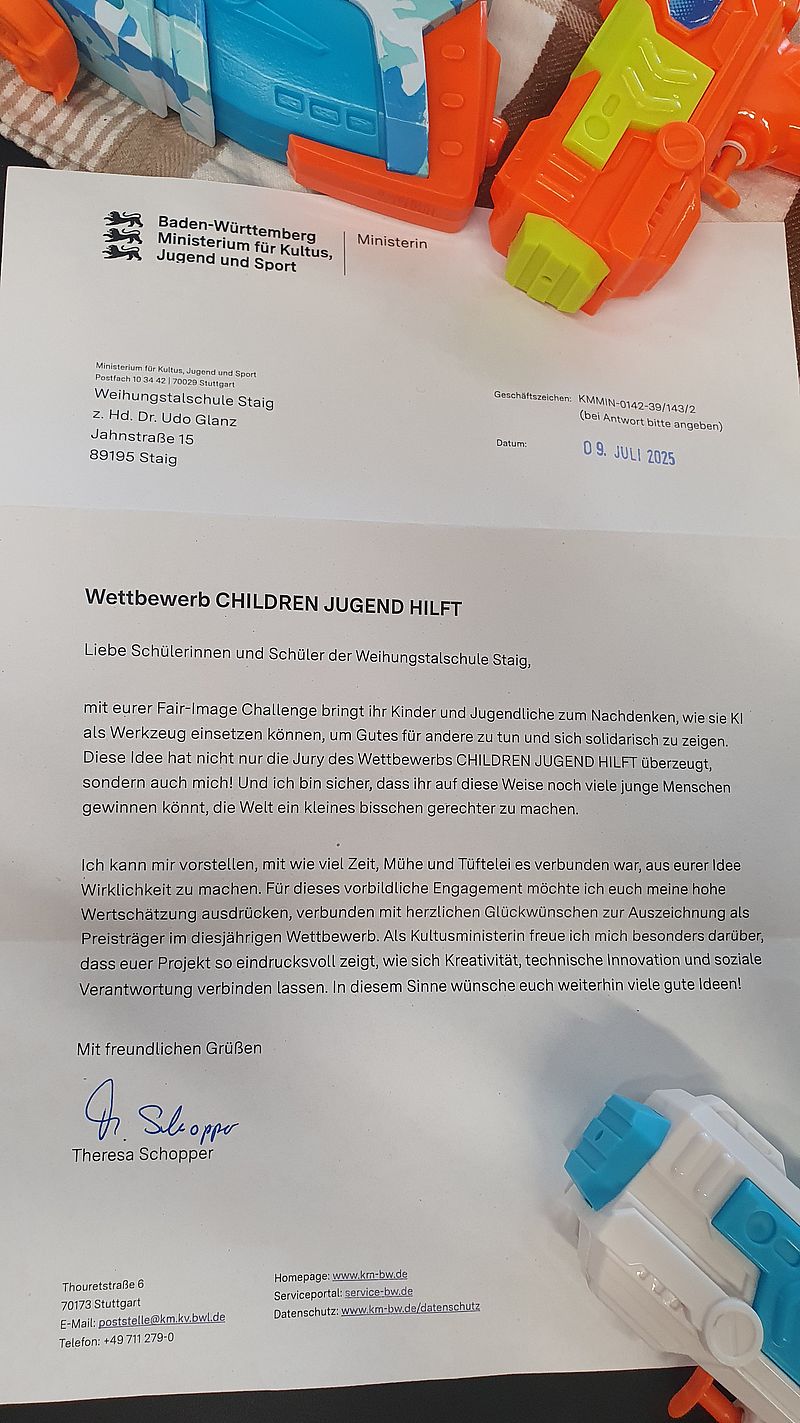 Die Schulfirma Fair Image.de der Weihungstalschule Staig engagiert sich freiwillig, kreativ und digital für eine fairere Welt. Mit dem Projekt "AI Fair Image Challenge" schaffen wir Produkte z.B. gegen Ausgrenzung oder für Gerechtigkeit – und verbinden dies mit direkter Unterstützung für tibetische Flüchtlingskinder, denen durch Spenden der Zugang zu Schulbildung ermöglicht wird. Wir bringen gesellschaftlich relevante Themen mit Hilfe von KI auf kreative Weise in die Öffentlichkeit. Im Zentrum des Engagements stehen: A) KI-generierte Bilder die auf Fair-Trade-Biobaumwolltaschen gedruckt und im Online-Shop angeboten werden, B) KI-Songs unserer KI-Band TheMonkeyDance.de, die auf Spotify, AppleMusic, YouTube usw. veröffentlicht werden und C) faire Bildung mit aiMOOCs auf aiMOOC.org: Persönliche, frei zugängliche, interaktive Lernkurse, die von ChatGPT erstellt werden (es gibt bereits 14.000 aiMOOCs). Mit der AI Fair-Image Challenge und weiteren Projekten wie aktuell „KI gegen Nazis“ laden wir die Welt ein, sich kreativ für eine bessere Welt auszudrücken. Fair-Image.de fördert Medienkompetenz, Demokratiebildung und globales Denken – mit niedrigschwelligen, digitalen Mitteln, die andere Schulen und Initiativen kostenlos nutzen können. Die Verbindung von technologischer Innovation, politischem Bewusstsein und sozialem Handeln macht das Projekt zu einem vorbildlichen Beispiel zukunftsorientierter Jugendbeteiligung.