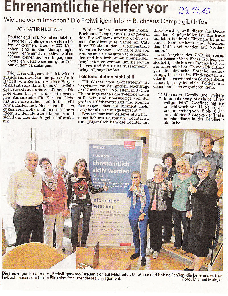 Die Freiwilligen-Info im Café des Buchhaus Thalia-Campe ist eine "externe Beratungsstelle" der Freiwilligenvermittlung: Jeden Mittwoch von 11-17 Uhr und jeden Freitag von 15-18 Uhr informieren die ehrenamtlichen Beraterinnen und Berater über die vielfältigen Möglichkeiten, in Nürnberg ehrenamtlich aktiv zu werden. Interessierte Bürgerinnen und Bürger erhalten sowohl allgemeine Informationen als auch konkrete Kontaktdaten zu gemeinnützigen Einrichtungen mit den für sie passenden Einsatzstellen. Auf Wunsch werden die Interessentinnen und Interessenten im weiteren "Ehrenamts-Findungs-Prozess" begleitet. Das Hauptziel dieser Kooperation mit dem Buchhaus ist für sie, durch die Lage in der Nürnberger Fußgängerzone eine größere Anzahl von potentiellen Freiwilligen und neue Zielgruppen zu erreichen; die Öffnungszeiten sind auch für berufstätige Menschen geeignet. Es handelt sich um offene Sprechstunden ohne Terminvergabe, um das Angebot möglichst niedrigschwellig zu halten.